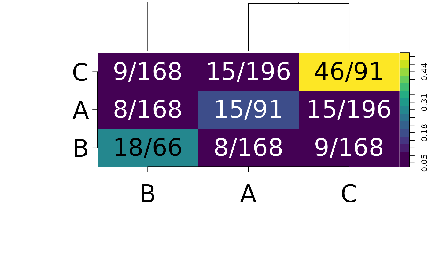 #> B "8/168" "9/168" "18/66"